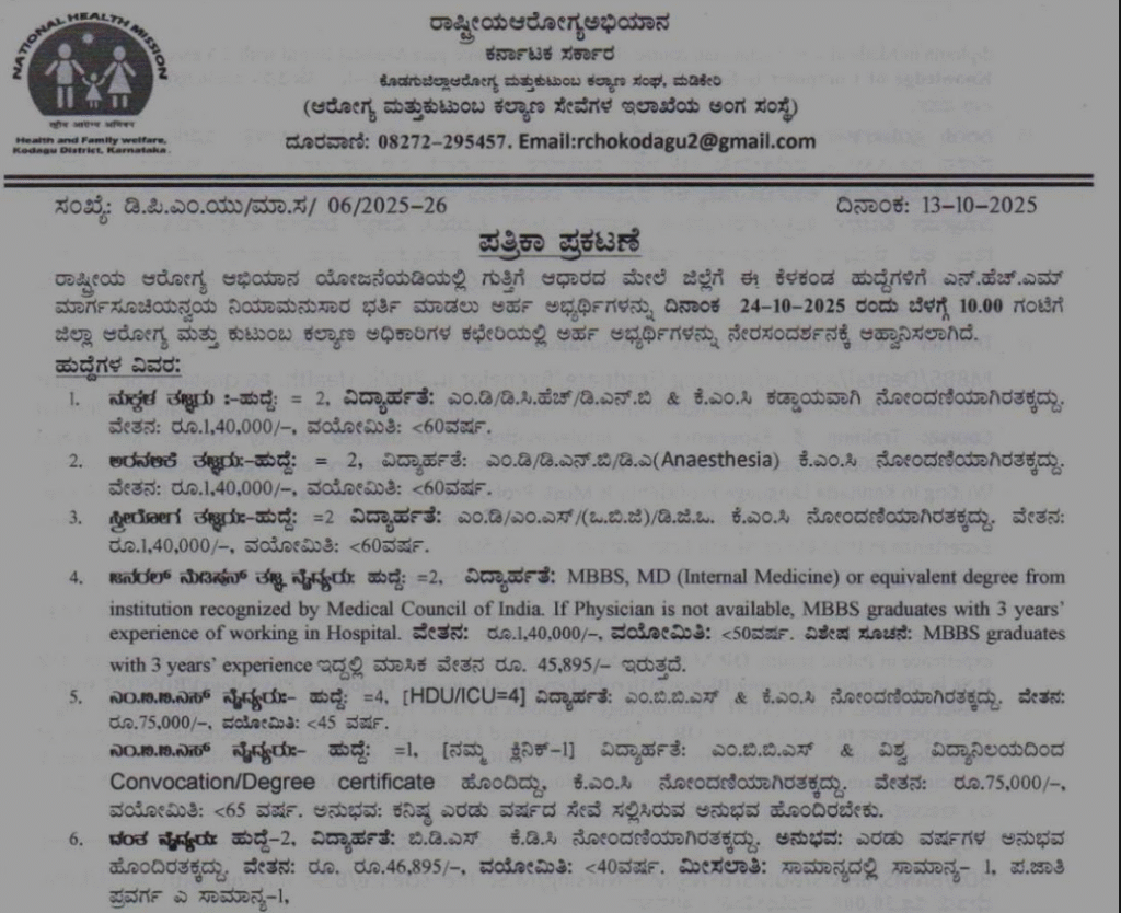 ರಾಷ್ಟ್ರೀಯ ಆರೋಗ್ಯ ಅಭಿಯಾನ, ಕೊಡಗು ಜಿಲ್ಲೆ ನೇಮಕಾತಿ ಪ್ರಕಟಣೆ